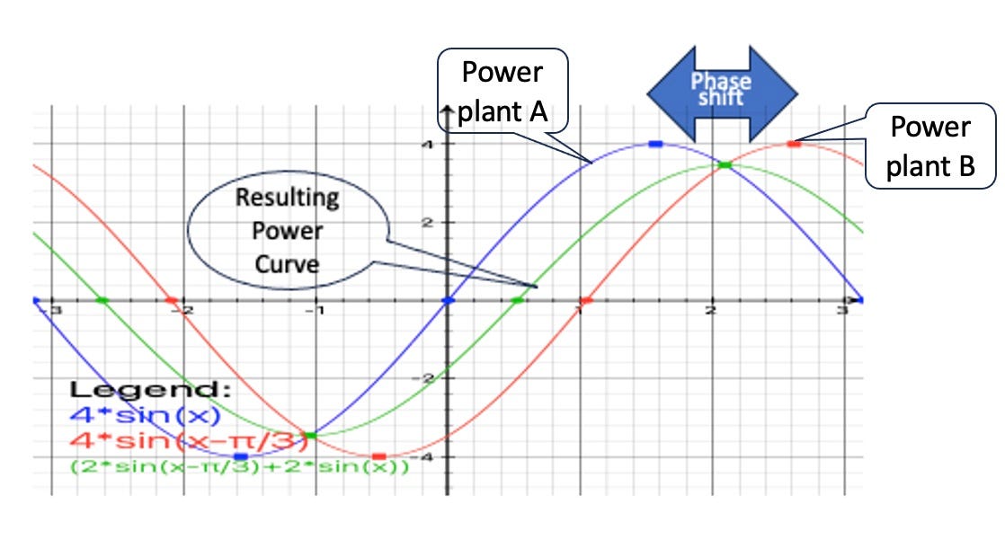 Here is a diagram demonstrating what happens when two plants (the red and blue lines) didn’t end up in Phase. Notice how it results in decreasing the grid voltage (green line). That green line would cause a brown-out.